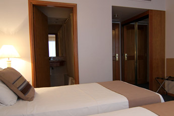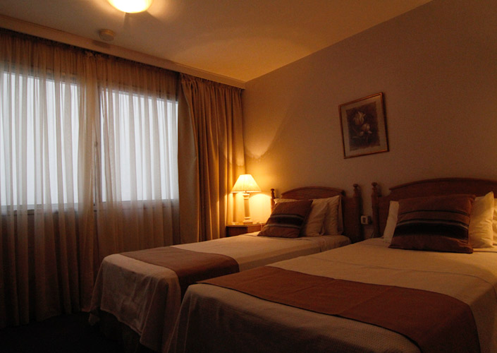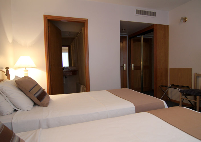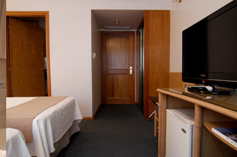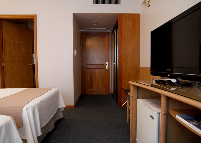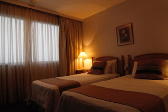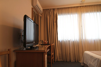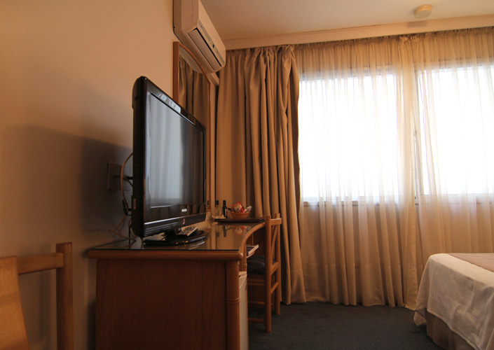 Habitación de ubicación central con ventanal entero curvo y vista panorámica a la Avda. 18 de Julio y la ciudad de Montevideo.
